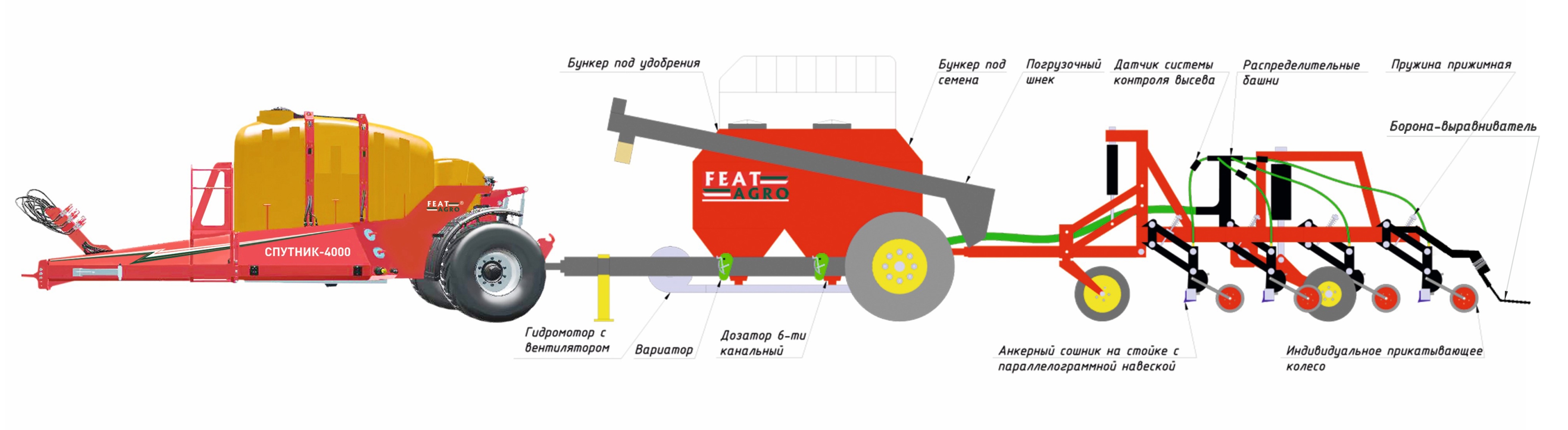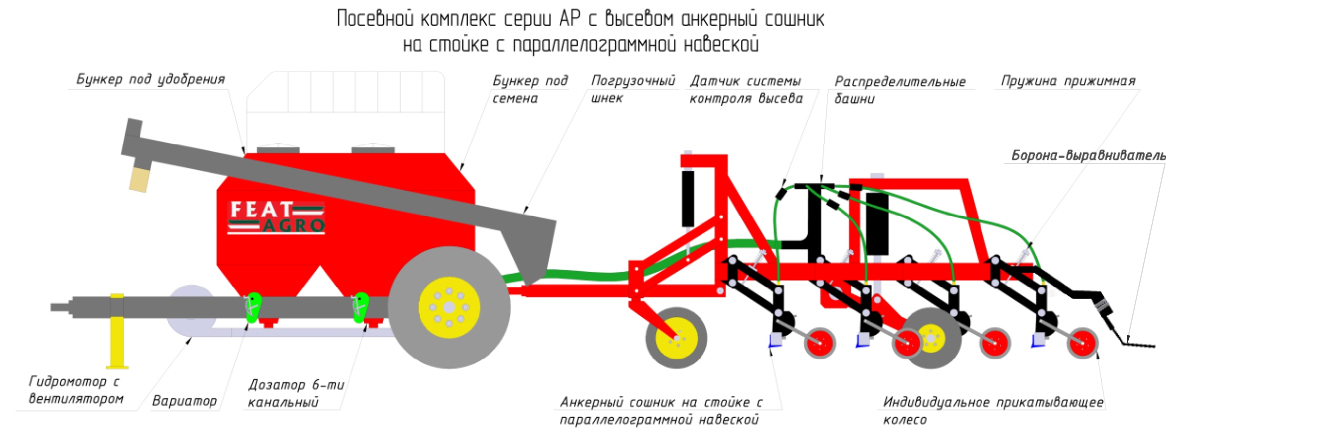 Высокоточное внесение семян и удобрений гарантированно, благодаря независимому сошнику с параллелограммной навеской, а прикатывающие колеса с шинами атмосферного давления позволяют работать в любых условиях, в том числе в условиях высокой влажности почвы. Конструкция стойки посевного комплекса с высевом в анкерный сошник на параллелограмме также гарантирует высокую способность прохождения пожнивных остатков. Данный посевной комплекс предназначен для строчного посева зерновых, зернобобовых и мелкосемянных культур по необработанному фону.